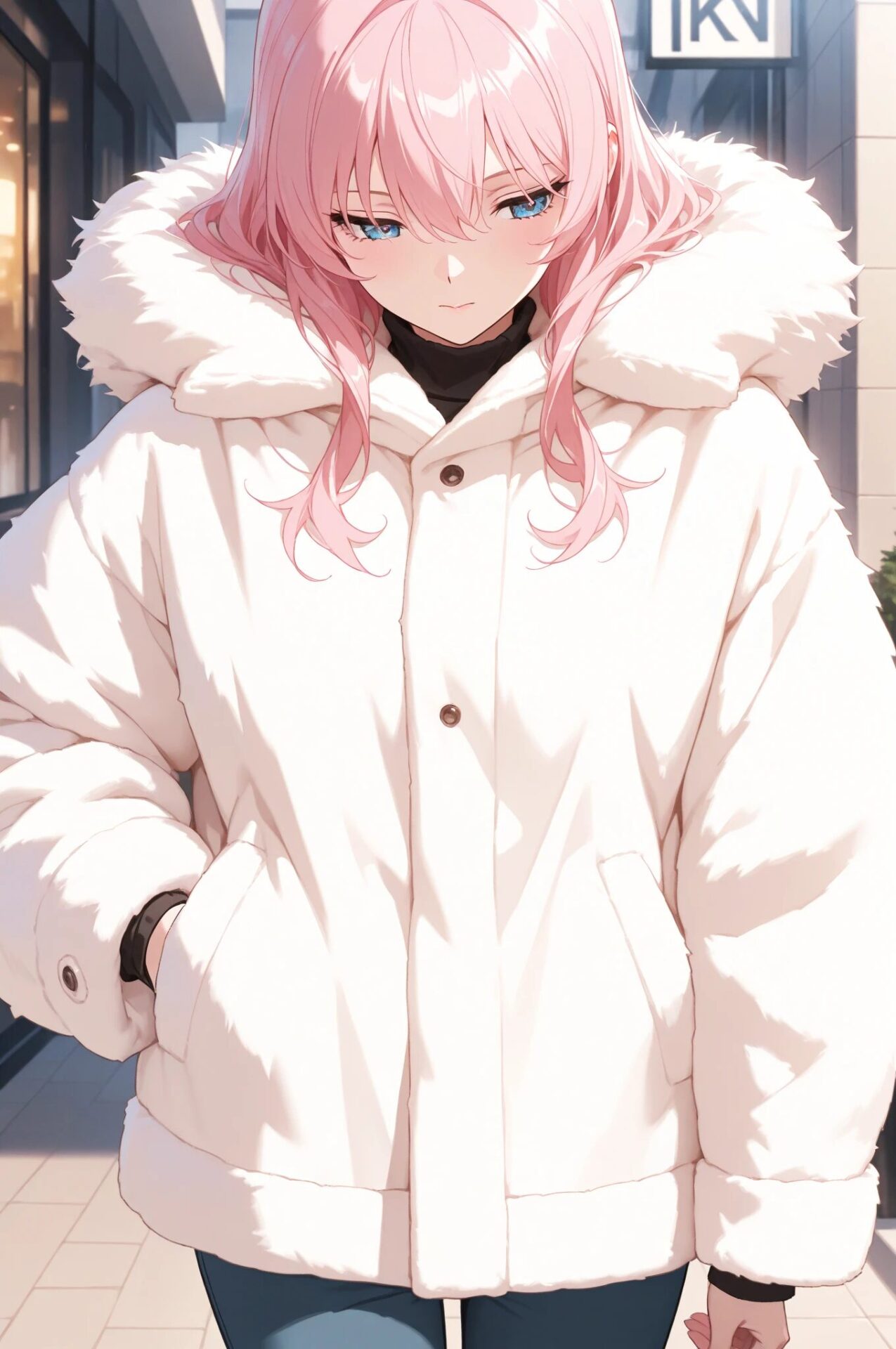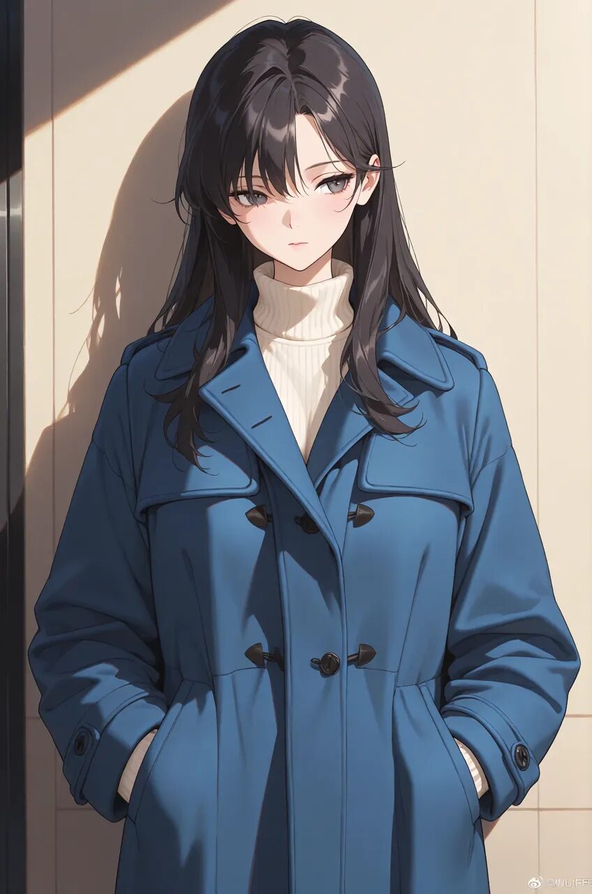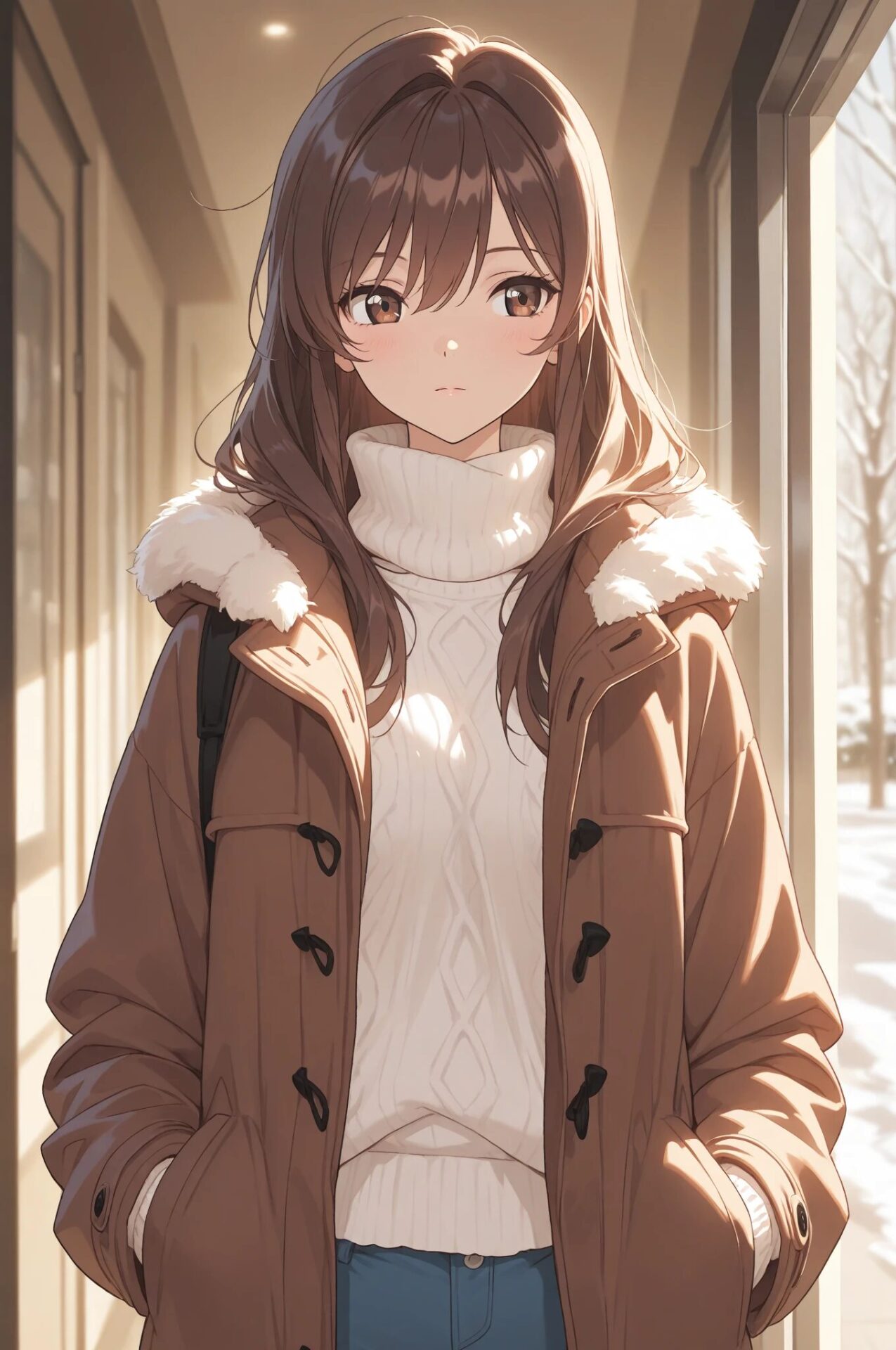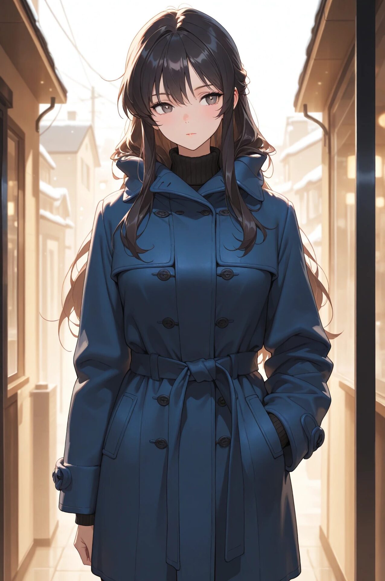1girl, winter outfit, long coat, turtleneck sweater, snowing, soft lighting