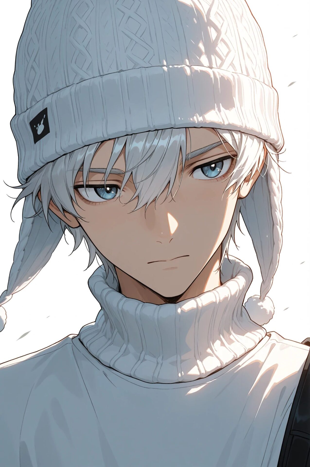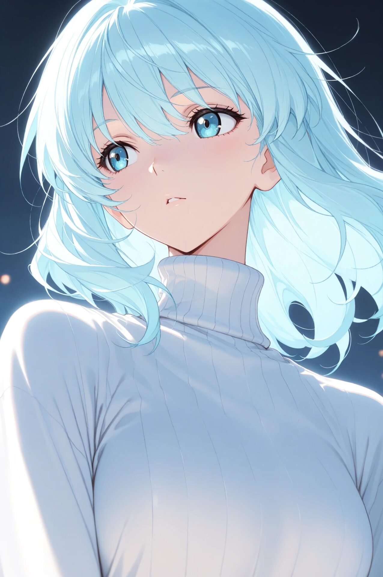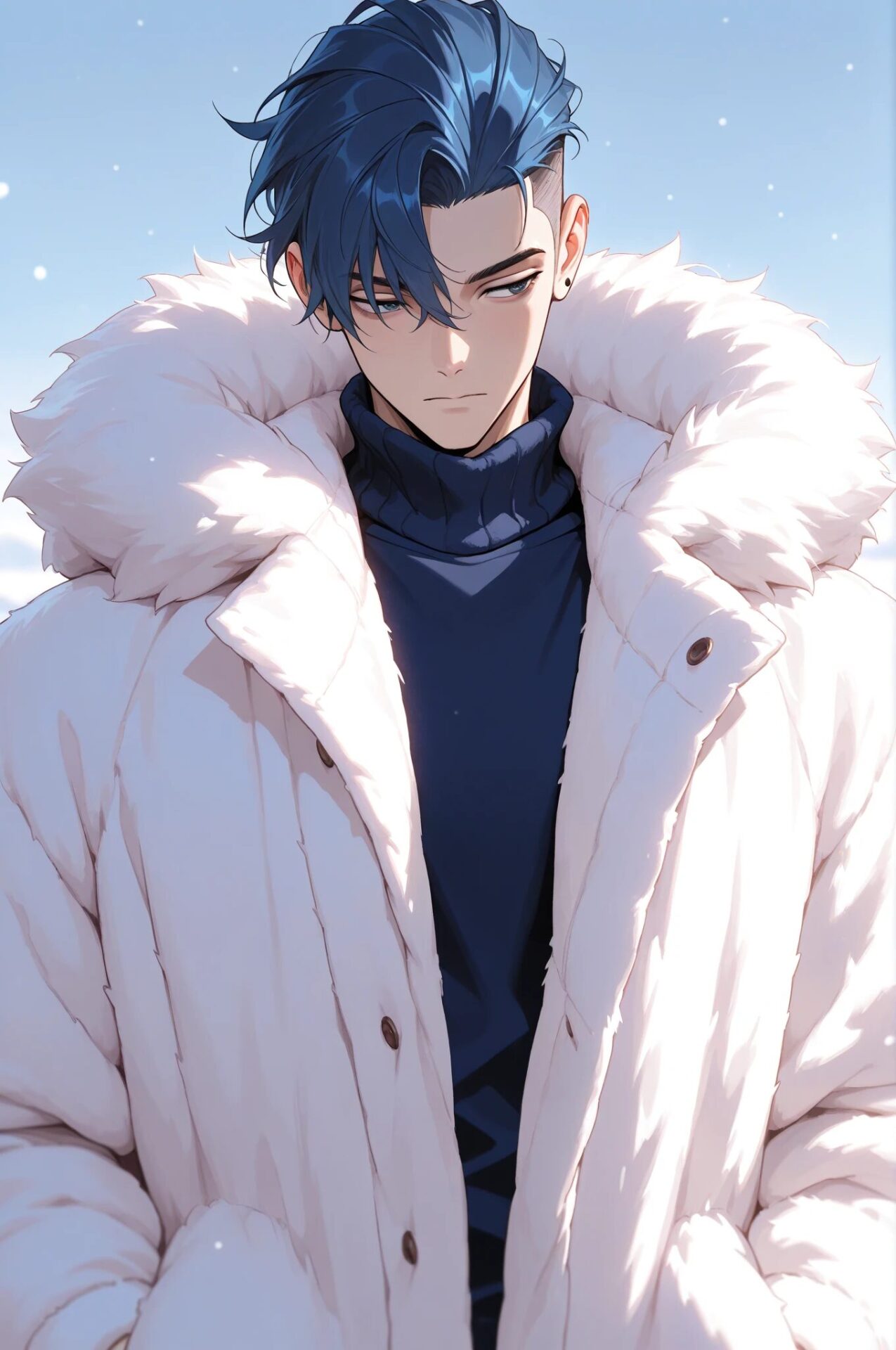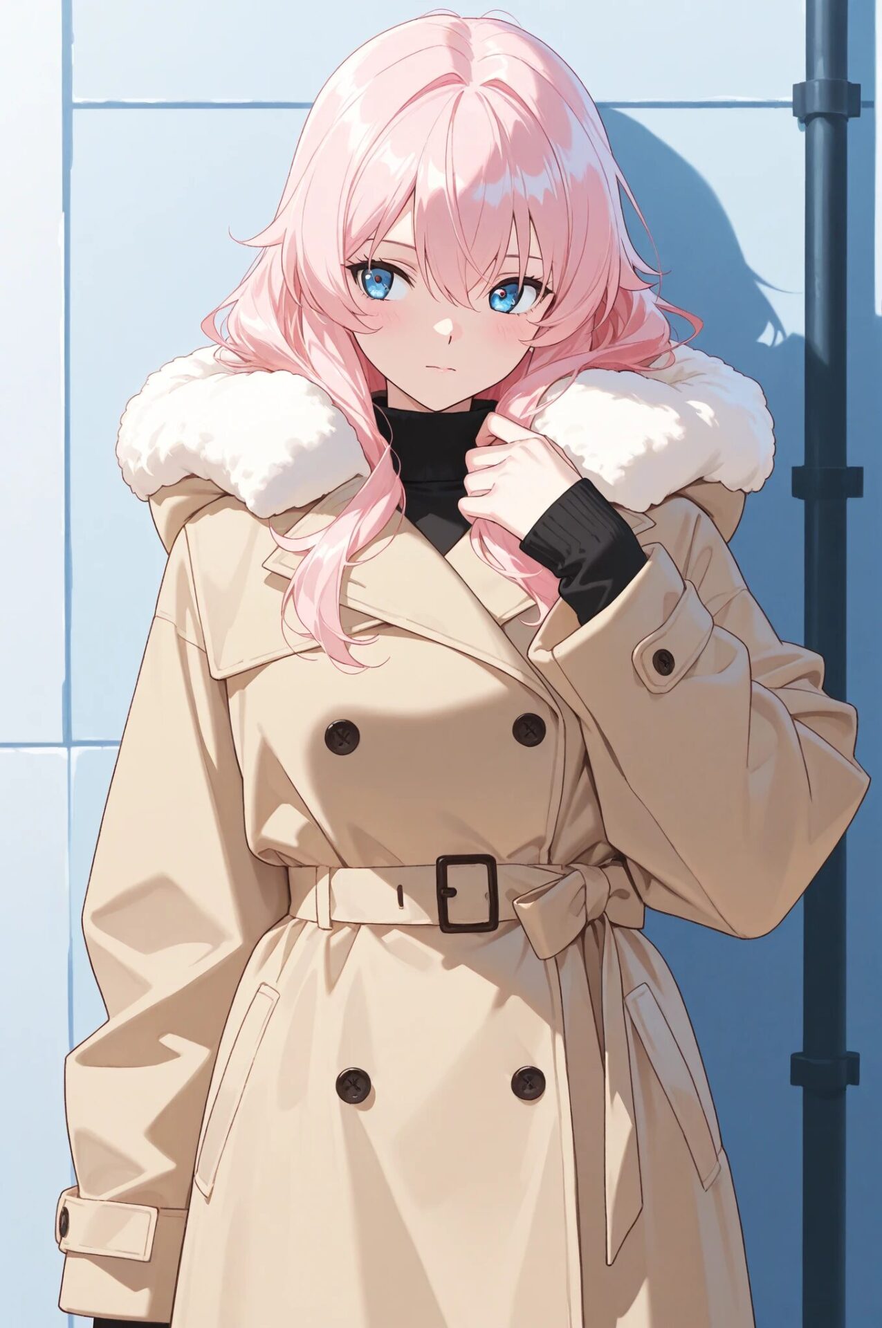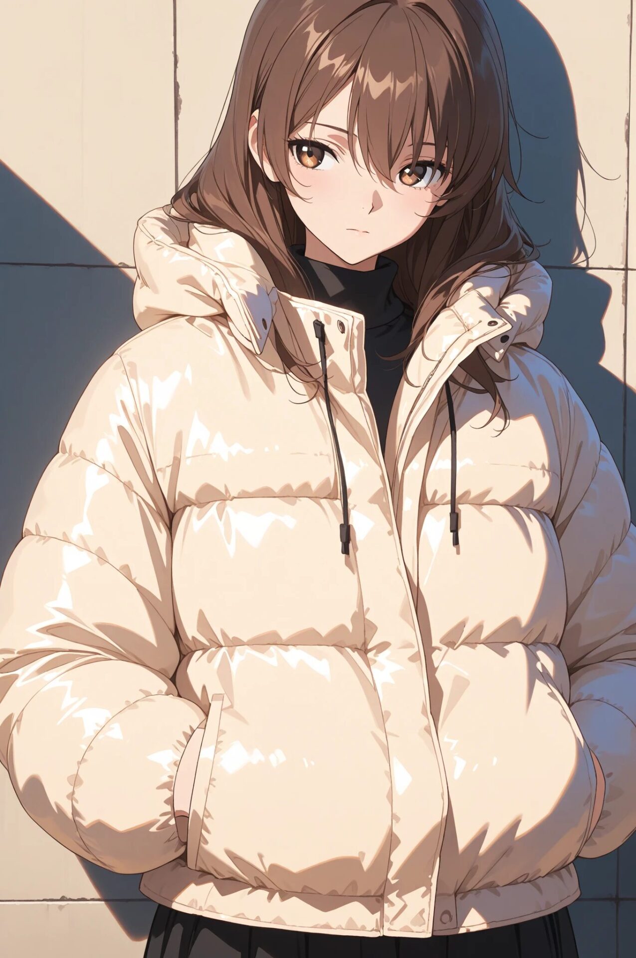1girl, winter outfit, long coat, turtleneck sweater, snowing, soft lighting